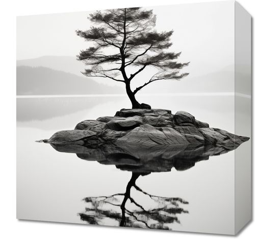 Obraz z serii pejzaże zatytułowany Samotne Drzewo to monochromatyczne zdjęcie prezentujące unikalną scenę – pojedyncze drzewo wyłaniające się z kamiennej wysepki na tle spokojnej, lustrzanej powierzchni wody. Obraz jest ujęciem w tonacji czerni i bieli, co nadaje mu ponadczasowy charakter i podkreśla minimalistyczną estetykę. Silny kontrast między ciemnymi konturami drzewa a jasnym tłem wody tworzy głębię i przykuwa uwagę. Odbicie drzewa w wodzie tworzy symetryczny i spokojny obraz, który może wnosić element spokoju i zamyślenia do każdego otoczenia. Ten obraz będzie doskonałym wyborem dla osób ceniących naturę, minimalizm oraz sztukę fotograficzną, idealny do powieszenia w salonie, biurze, czy jako element dekoracyjny w przestrzeniach wellness i spa.