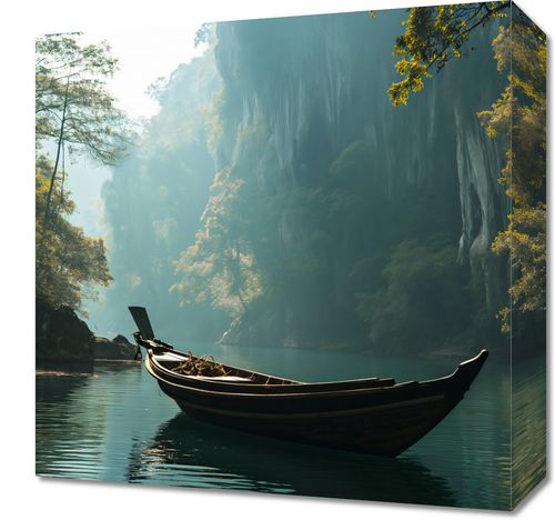 Obraz z serii pejzaże zatytułowany Samotność na Tafli przedstawia idylliczny krajobraz, w którym centralnym punktem jest drewniana łódka unosząca się na spokojnych wodach jeziora. Otoczona przez majestatyczne, zielone drzewa i klify, które otulają wodę jak opiekuńcze ramiona, scena ta jest utrzymana w ciepłych, naturalnych barwach. Promienie słoneczne przebijają się przez liście, tworząc efekt tajemniczego światła i cieni na wodnej tafli. Całość kompozycji wywołuje uczucie spokoju i kontemplacji, idealnie oddając atmosferę zacisznego zakątka, oderwanego od zgiełku codzienności. Obraz ten będzie pasował do wnętrz, które pragną podkreślić łączność z naturą i stworzyć oazę spokoju, takich jak gabinety relaksacyjne, pokoje medytacyjne czy nawet jako spokojny akcent w nowoczesnych biurach.