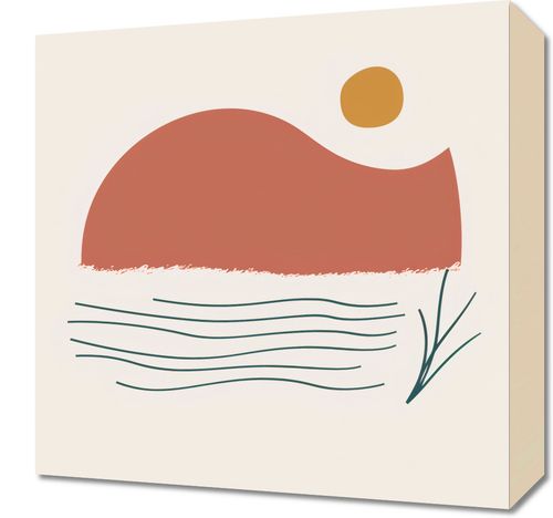 Obraz z serii boho zatytułowany Serenada Zachodzącego Słońca.Ten obraz oddaje spokojny krajobraz zachodu słońca w stylu minimalistycznym. Duży, łagodny wzgórze w ciepłym czerwonym kolorze dominuje kompozycję, a powyżej, w spokojnym niebie, słońce świeci w odcieniach złota. Proste linie poniżej wzgórza mogą symbolizować spokojne fale wody, a zielone elementy przywodzą na myśl ciche szumienie traw. Dzieło to doskonale nadaje się do każdego wnętrza, w którym chcemy wprowadzić elementy spokoju i natury, zachowując jednocześnie prostotę i czystość form. Świetnie sprawdzi się w przestrzeniach takich jak salon, sypialnia, czy miejsce przeznaczone do medytacji i wyciszenia.