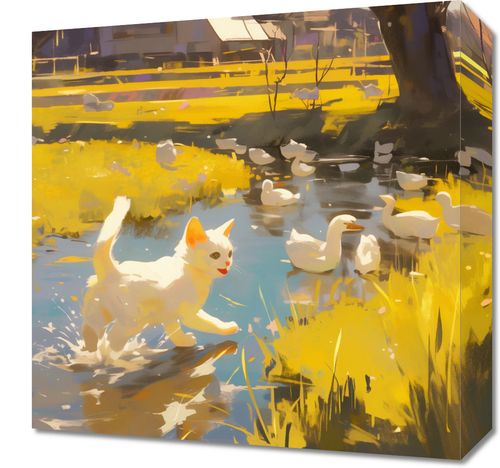 Obraz z serii abstrakcja zatytułowany Słońce na Wsi. Przedstawia idylliczną, słoneczną scenę na wsi, gdzie głównymi bohaterami są bawiący się kotek i grupa kaczek w tle. Kot, o białym umaszczeniu z jasnymi plamami, jest uchwycony w ruchu, co nadaje scenie dynamiki. Kaczki spokojnie pływają po lustrzanej tafli wody, otoczonej przez żywo żółtą trawę, co tworzy kontrast z białym kotem. Światło słoneczne rozświetla scenę, nadając jej ciepły, przyjemny nastrój. Obraz ma wyraźnie impresjonistyczny charakter, z luźnymi pociągnięciami pędzla i żywymi plamami kolorów, co czyni go atrakcyjnym dla tych, którzy cenią sobie wiejski spokój i piękno natury. Idealnie pasowałby do wnętrz, które mają na celu stworzenie atmosfery relaksu i spokoju, jak pokoje dzienne, przestrzenie odpoczynkowe, a nawet pokoje dla dzieci.