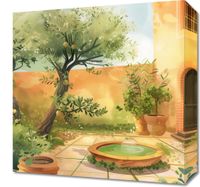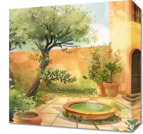 Obraz z serii abstrakcja zatytułowany Słoneczny Dzień. Obraz ukazuje idylliczny ogród w ciepły, słoneczny dzień. Widoczna jest część kamiennego patio otoczonego bujną roślinnością, z dojrzałymi cytrynami wiszącymi na gałęziach niewielkich drzew. W centrum kompozycji znajduje się dekoracyjny kamienny basen z delikatnym strumieniem wody. Na pierwszym planie widać donice z różnorodnymi roślinami, które dodają scenie domowego ciepła. Jaskrawość słońca jest złagodzona przez liście drzew, tworząc wzorzyste cienie na płytach chodnika. Architektura w tle, z żółtymi ścianami i ciemnymi drewnianymi drzwiami, współgra z naturalną paletą kolorów ogrodu. Atmosfera obrazu jest spokojna i relaksująca, sugerująca miejsce ucieczki i odpoczynku.