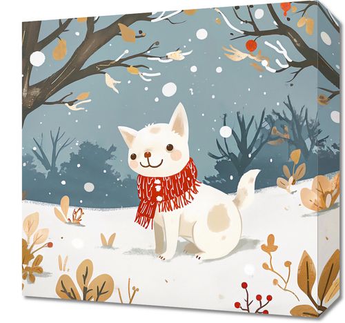 Obraz z serii wnętrza zatytułowany Śnieżny Kompan. Urocze przedstawienie białego, puchatego psa w czerwonym szaliku, który przywołuje ciepłe uczucia w chłodnym, zimowym otoczeniu. Zwierzę z radosnym wyrazem twarzy wydaje się cieszyć spadającymi płatkami śniegu, co dodaje obrazowi poczucia radości i bezpretensjonalnej zabawy. Tło w pastelowych odcieniach bieli i szarości z delikatnymi akcentami kolorystycznymi tworzy spokojną i relaksującą atmosferę. Obraz idealnie nadaje się do dekoracji pomieszczeń dziecięcych, salonów, czy przytulnych kawiarni, wprowadzając do wnętrza element zabawy i niewinności. Jego ciepłe barwy i sympatyczny motyw sprawią, że będzie doskonałym dodatkiem do miejsc, w których chcemy poczuć odrobinę zimowego ciepła i uroku.