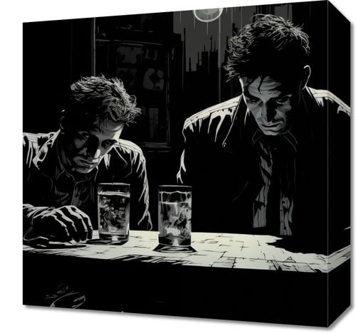 Obraz z serii abstrakcja zatytułowany Spiskowcy. Ta grafika przedstawia dwóch mężczyzn zanurzonych w głębokiej konwersacji przy barowym stole. Stylizacja na czarno-biało uchwyciła napięte, dramatyczne oświetlenie i cienie, które nadają scenie klimat tajemniczości i suspensu. Wyraźne kontury i kontrastowe światłocienie podkreślają wyraziste postaci mężczyzn i ich zacięte postawy. Obraz ten przemawia do miłośników klasycznego kina i literatury, doskonale nadając się do dekoracji przestrzeni o męskim charakterze, takich jak prywatne gabinety, domowe bary czy miejsca spotkań.