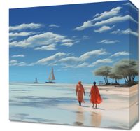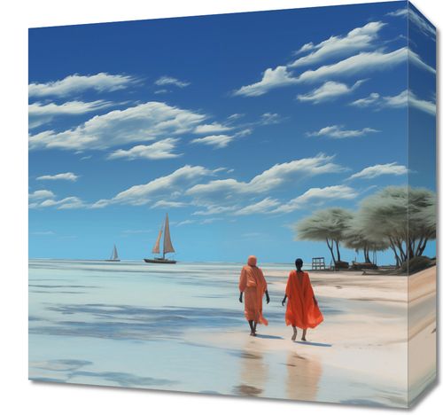 Obraz z serii pejzaże zatytułowany Spokój w Piaskach przedstawia dwie postacie w tradycyjnych pomarańczowych szatach, kroczących boso po dziewiczym piasku plaży. Ich spokojny postęp odzwierciedla harmonię i spokój, a delikatne fale i żaglowce w tle dodają uczucia swobody. Płynące chmury na niebie nadają scenie wrażenie przestrzeni i czasu, który wydaje się zatrzymany. Ten obraz emanuje duchowym spokojem i jest idealny do pomieszczeń przeznaczonych do medytacji, wypoczynku lub terapii, a także jako spokojny akcent w przestrzeniach hotelowych czy biurowych, gdzie zachęca do refleksji i wewnętrznej harmonii.