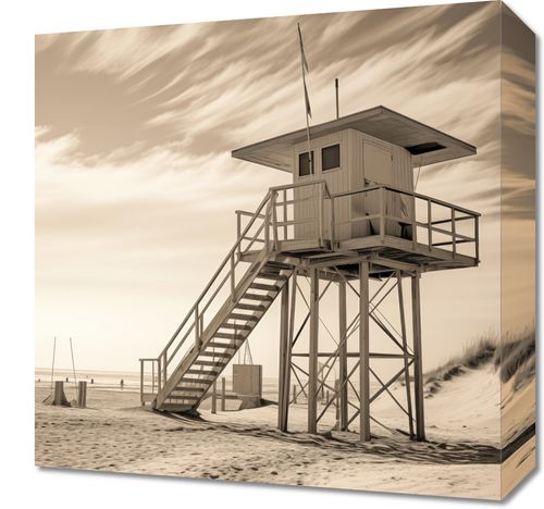 Obraz z serii pejzaże zatytułowany Strażnik Wydm. Prezentuje on sepiową scenę z wieżą ratownika na pustej plaży. Nostalgiczna tonacja obrazu podkreśla samotność struktury i piękno otaczającej ją dzikiej przyrody. Dramatyczne chmury na niebie i ślady na piasku prowadzą wzrok ku wieży, dodając głębi i historii miejscu. Ten obraz idealnie nadaje się do wnętrz, w których pragnie się wywołać uczucie spokoju, przestrzeni i czasów minionych, takich jak salony, pokoje wypoczynkowe, a także przestrzenie publiczne lub prywatne biura, które cenią sobie klasyczny wygląd i atmosferę.