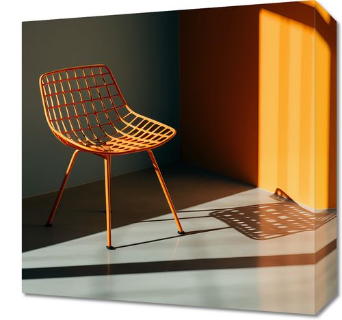 Obraz z serii wnętrza zatytułowany Świetlista Gra. Prezentuje on minimalistyczne podejście do designu, gdzie każda linia i kształt ma swoje znaczenie. Jasne odcienie pomarańczu rzucające się na prostą, ale stylową metalową krzesło tworzą dynamiczny efekt cienia i światła, który jest jednocześnie subtelnym, ale i wyrazistym elementem dekoracyjnym. Idealny dla nowoczesnych przestrzeni biurowych lub mieszkalnych, wprowadzając do nich artystyczną atmosferę z nutą awangardy. To dzieło sztuki doskonale komponuje się z surową elegancją współczesnych, urbanistycznych wnętrz.