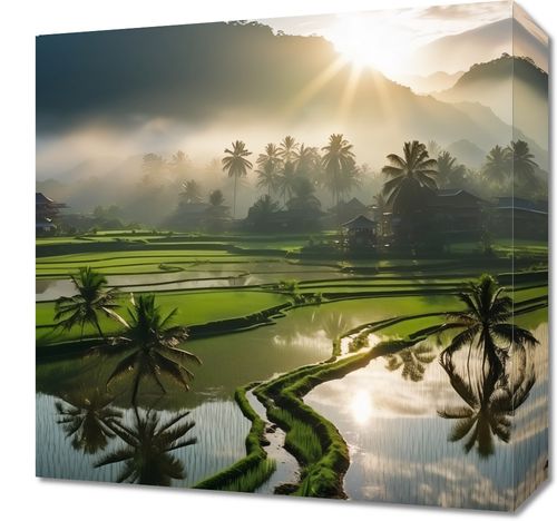 Obraz z serii pejzaże zatytułowany Świt nad Tarasami. Ta zachwycająca scena przedstawia malownicze tarasy ryżowe, kąpane w ciepłym świetle wschodzącego słońca. Mgła delikatnie opada na zielone pola, a w tle majaczą zarysy gór, dodając głębi i tajemniczości krajobrazowi. Palmy i tradycyjne chaty dopełniają obrazu, tworząc wizję spokoju i harmonii z naturą. Obraz emanuje spokojem i jest hołdem dla prostoty wiejskiego życia. Idealnie wkomponuje się w przestrzenie, gdzie chcemy wprowadzić element uspokajający i zainspirowany naturą, jak medytacyjne spa, poczekalnie w klinikach wellness czy prywatne biblioteki.