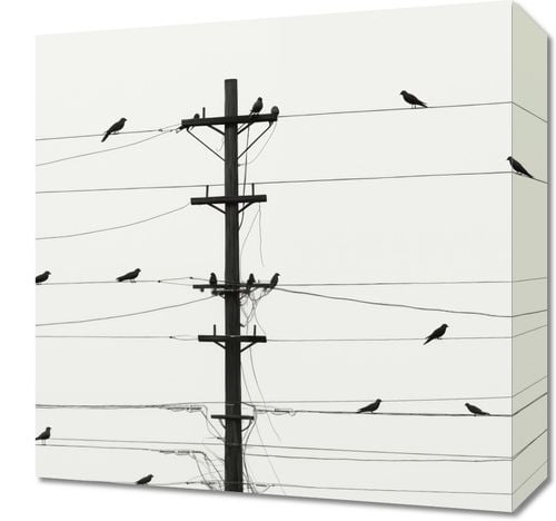 Obraz z serii pejzaże zatytułowany Symfonia na Drutach. Prezentuje on prostotę miejskiego krajobrazu, gdzie ptaki siedzą równomiernie rozmieszczone na przewodach telefonicznych. Czyste tło i sylwetki ptaków na linii energetycznej tworzą graficzny i rytmiczny wzór, który jest zarówno spokojny, jak i dynamiczny. Ten obraz to hołd dla nieoczekiwanej urody w codziennych scenach miejskich, idealny dla tych, którzy cenią sobie prostotę i nowoczesny design. Pasuje do nowoczesnych wnętrz biurowych, minimalistycznych salonów oraz wszędzie tam, gdzie sztuka ma za zadanie wprowadzać element spokoju i porządku.