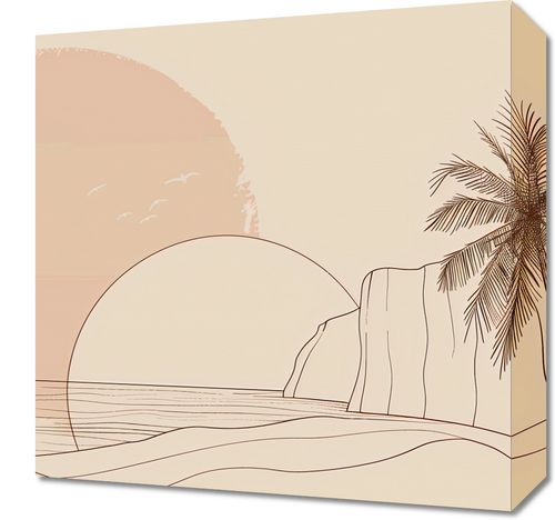 Obraz z serii minimalistyczne zatytułowany Szept Tropików. Plakat przedstawia delikatnie zarysowany krajobraz tropikalny o wschodzie lub zachodzie słońca. W centralnej części kompozycji widnieje wielki, ciepły dysk słońca, którego połowa chowa się za horyzontem. U jego podstawy majaczą delikatne linie morza, a na pierwszym planie z prawej strony wznosi się smukła palma o finezyjnie narysowanych liściach. Z lewej strony rysunek przedstawia wysokie klify, które wyłaniają się z morza, a na tle słońca można dostrzec lekkie sylwetki ptaków. Ten plakat to kwintesencja spokoju i harmonii, świetnie sprawdzi się w pomieszczeniach, które mają być oazą relaksu, takich jak salon, sypialnia czy pokój do medytacji. Jego ciepłe, pastelowe barwy i proste linie mogą również dodać elegancji i spokoju do przestrzeni biurowych, wspomagając skupienie i kreatywne myślenie.