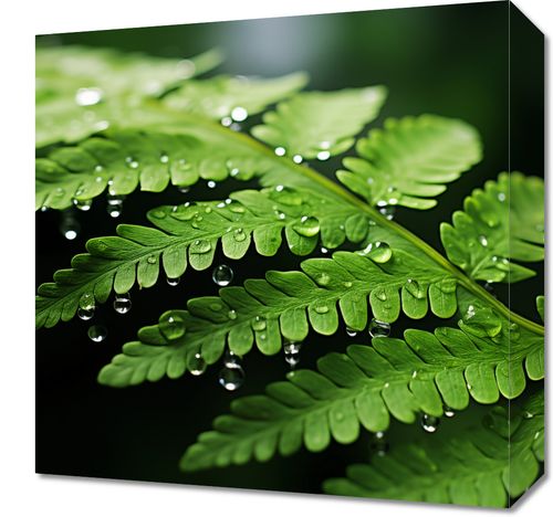 Obraz z serii natura zatytułowany Szepty Natury, prezentuje zbliżenie na liść paproci okryty kropelkami rosy, które lśnią jak drogocenne klejnoty na jego witalnie zielonej powierzchni. Delikatność każdej kropli wody, zawieszonej jakby na skraju czasu, oddaje spokój i harmonię natury, jednocześnie przywołując uczucie świeżości i ożywienia. Tło obrazu jest głębokie i jednolite, co pozwala zaakcentować jasne zieleń liści i przezroczystość wody. Ten obraz może być symbolem czystości i nowych początków, idealnie wkomponuje się w przestrzenie skoncentrowane na zdrowiu i dobrostanie, takie jak gabinety lekarskie, spa, czy też jako element dekoracyjny w łazienkach i pomieszczeniach relaksacyjnych, przynosząc uczucie spokoju i odświeżenia.