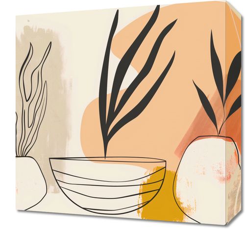 Obraz z serii boho zatytułowany Szkice Botaniczne. Na obrazie przedstawiono stylizowane rośliny o delikatnych, ale wyrazistych konturach w dwóch kontrastujących doniczkach, które stanowią centralny punkt kompozycji. Tło, składające się z abstrakcyjnych kształtów i pociągnięć pędzla w ciepłej palecie barw - od terrakoty do bladego koralu - zapewnia przyjemny kontrast dla czarnych linii roślin. Minimalistyczny charakter ilustracji, w połączeniu z organicznymi formami i neutralnymi barwami, sprawia, że jest to idealny element do wnętrz, które cenią prostotę i spokój, takich jak nowoczesne biura, jadalnie czy salony, gdzie może wprowadzić lekkość i świeżość wizualną.