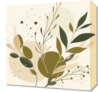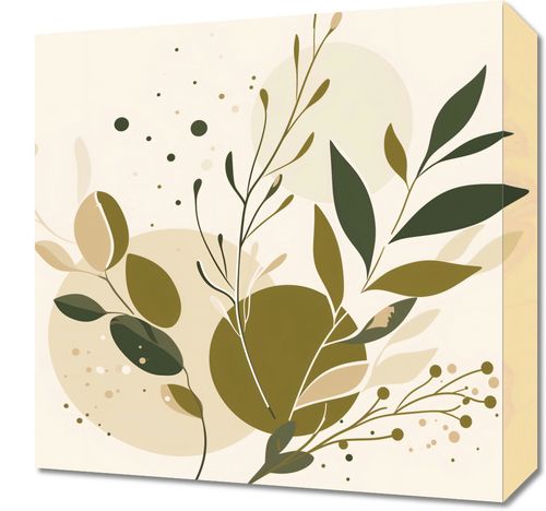 Obraz z serii minimalistyczne zatytułowany Szronowata Barwa. Przedstawia on delikatną kompozycję liści i gałązek w tonacjach zieleni i beżu, na łagodnym tle w pastelowych barwach, z dyskretnymi kropeczkami przypominającymi spokojny deszcz dodając elementu kontemplacji. Ten obraz wprowadzi harmonię i delikatność do każdego pomieszczenia. Jego stonowane kolory i prosta forma doskonale odnajdą się w przestronnych i jasnych wnętrzach, takich jak skandynawskie mieszkania, biura, czy salony spa.