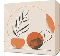 Obraz z serii boho zatytułowany Tonacja Pasteli. Obraz przedstawia harmonijną kompozycję elementów natury i abstrakcyjnych kształtów. Widzimy doniczkę z delikatną rośliną o czarnych, smukłych liściach, które delikatnie kontrastują z ciepłym odcieniem pomarańczy naczynia. Towarzyszą jej geometryczne formy: dwa krągłe kształty w tonacji ziemi, które przeplatają się, tworząc iluzję przestrzeni i głębi. Rysunek uzupełnia subtelna linia horyzontu i rozproszone kropki, dodające plakatowi dynamiki. Idealnie sprawdzi się jako element dekoracyjny w pomieszczeniach, gdzie dominuje spokój i równowaga, takich jak jasne, przestronne salony, pokoje do medytacji lub ciche zakątki bibliotek.