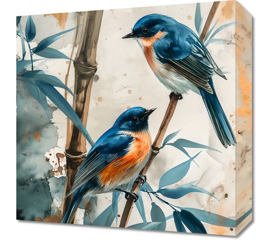 Obraz z serii natura zatytułowany Trzy Ptaki prezentuje trzy ptaki - dwa siedzące spokojnie na bambusowych gałązkach i jednego w locie - na tle akwarelowego, delikatnie zabarwionego krajobrazu. Ptaki, o intensywnie niebiesko-pomarańczowym upierzeniu, są przedstawione z wyraźnymi detalami, które kontrastują z bardziej abstrakcyjnym i eterycznym tłem. Plama akwarelowa łączy w sobie odcienie beżu i szarości, z subtelnymi akcentami złota, co dodaje kompozycji elegancji i lekkości. Ten obraz może przynieść uczucie spokoju i równowagi do każdego wnętrza, idealny dla salonów, przestrzeni wypoczynkowych, a nawet biur, gdzie naturalna piękność i spokój są cenione.