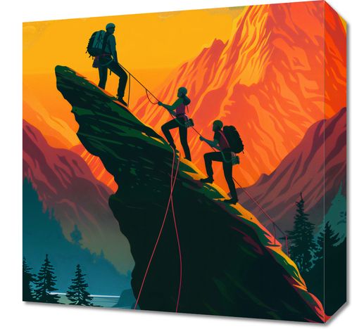 Obraz z serii abstrakcja zatytułowany U Szczytu przedstawia grupę wędrowców wspólnie zdobywających szczyt górski przy zachodzie słońca. Scena jest nasączona żywymi odcieniami pomarańczy i czerwieni, które tworzą dramatyczny, ale piękny kontrast z ciemnozielonymi drzewami i skalistym terenem. Sylwetki wędrowców są w centrum kompozycji, wyraźnie zarysowane przeciwko tłu światła słonecznego, co podkreśla ich osiągnięcie i trud włożony w zdobycie szczytu. Przepiękny zachód słońca z dużym, jasnym słońcem na horyzoncie nadaje całej scenie uczucie spokoju i spełnienia. Obraz ten oddaje ducha przygody i piękno natury, idealny dla miłośników gór i tych, którzy cenią siłę ludzkiego ducha. Doskonały do dekoracji ścian w domach, schroniskach górskich lub jako inspiracja w przestrzeniach, gdzie docenia się przyrodę i aktywny tryb życia.