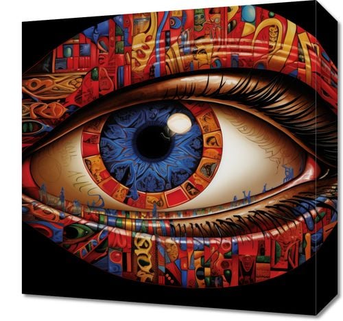 Obraz z serii abstrakcja zatytułowany W Oku Obserwatora. Ta złożona, surrealistyczna grafika przedstawia ludzkie oko, w którego tęczówce odzwierciedlone są bogate, abstrakcyjne i symboliczne wzory, przypominające fragmenty różnych dzieł sztuki. Barwne motywy w tęczówce mieszają się z intensywną czerwienią, żółcią i niebieskością, tworząc efekt kalejdoskopu kulturowych wpływów. Zadziwiająca szczegółowość pracy sugeruje głębię ludzkiego spojrzenia i różnorodność perspektyw, które możemy doświadczać poprzez sztukę. Obraz ten z pewnością zaintryguje i stanie się punktem centralnym każdej przestrzeni, szczególnie tam, gdzie sztuka i kreatywność są w cenie, jak studia artystyczne, galerie, czy nowoczesne salony.