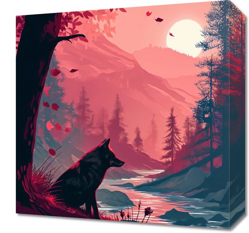Obraz z serii abstrakcja zatytułowany Wilk Przy Brzegu Lasu przedstawia urzekającą scenę, w której wilk stoi na brzegu lasu, wpatrując się w odległy zachód słońca. Idylliczny krajobraz ukazuje rzekę wijącą się między drzewami, a w tle majestatyczne góry przybierające ciepłe odcienie zachodzącego słońca. Niebo w odcieniach różu i pomarańczy odbija się w spokojnych wodach rzeki, tworząc lustrzane odbicie, które dodaje głębi kompozycji. Spadające liście z drzew o ciepłych, jesienno-czerwonych barwach, wirują wokół wilka, dodając dynamiki i uczucia zmienności pór roku. Ten plakat idealnie wpasuje się w wnętrza o tematyce natury i dzikiej przyrody, takie jak pokoje o tematyce przyrodniczej, przestrzenie wypoczynkowe, a także jako inspirujący element dekoracyjny w biurach i domowych gabinetach, przypominając o sielskich i spokojnych aspektach życia.