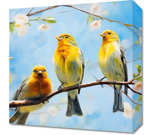 Obraz z serii natura zatytułowany Wiosenne Pogwizdy - malowniczy portret czterech zięb na gałęzi w otoczeniu delikatnych, białych kwiatów, z tłem w odcieniach błękitu przypominających wiosenne niebo. Złociste i żółte barwy ptaków wspaniale kontrastują z pastelowymi akcentami otoczenia, tworząc obraz pełen życia i świeżości. Wyraźne pociągnięcia pędzla i żywa paleta barw nadają dziełu dynamiki, jednocześnie zachowując łagodny charakter. To doskonały wybór dla przestrzeni, które mają odzwierciedlać optymizm i nowe początki, idealny do salonów, poczekalni lub jako element dekoracyjny w przychodniach.