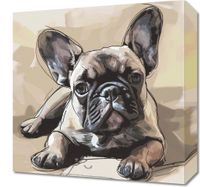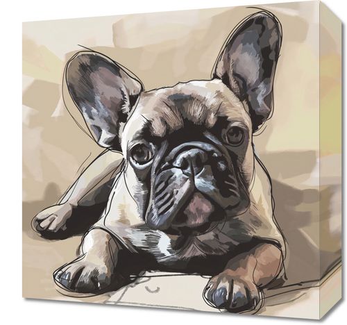 Obraz z serii wnętrza zatytułowany Zawsze Czeka, przedstawia realistycznie oddanego buldoga francuskiego w odcieniach beżu i brązu, z charakterystycznymi dużymi uszami i głębokim spojrzeniem. Pies leży na ciepło oświetlonym podłożu, a jego cień rozmywa się w tle. Użyta paleta kolorów nadaje obrazowi przytulny i domowy nastrój, podczas gdy szczegółowe tekstury sierści dodają głębi i realizmu. Ten obraz idealnie wpasuje się w wnętrza domowe, wnosząc element ciepła i towarzyskości. Może być doskonałym akcentem w salonie, gdzie domownicy i goście często gromadzą się na wspólne chwile, lub w przestrzeniach dedykowanych miłośnikom zwierząt.