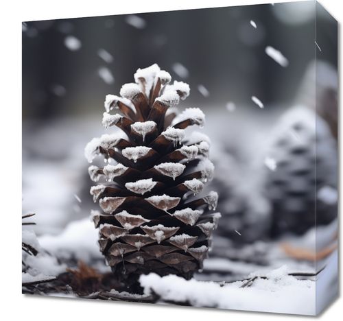 Obraz z serii natura zatytułowany Zimowy Spokój przedstawia pierwszoplanową, majestatyczną szyszkę pokrytą świeżym, puszystym śniegiem, która jest wyrazem naturalnej elegancji i spokoju zimowego lasu. Delikatne płatki śniegu delikatnie opadają wokół, podkreślając ciszę i harmonię zimowego krajobrazu. Szyszka, uchwycona w chwili niewinnej, czystej piękności, jest otoczona mrocznym, rozmytym tłem, co nadaje głębi i tajemniczości tej scenie. Ten plakat idealnie pasowałby do przestrzeni, która pragnie wnieść odrobinę zimowej magii i kontemplacji, takich jak ciche kąciki czytelnicze, przytulne salony lub biura o subtelnym wystroju, a także doskonale nadaje się jako sezonowa dekoracja w hotelach i spa, gdzie panuje atmosfera odprężenia i odpoczynku.