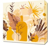 Obraz z serii minimalistyczne zatytułowany Złote Rośliny. Na tym jasnym i przyjemnym dla oka dziele sztuki widzimy kolekcję roślin i butelek w ciepłej, jesiennej palecie kolorów, od jasnych beżów po złociste żółcie i głębokie brązy, tworząc zrelaksowaną atmosferę. Ten obraz doskonale uzupełni wnętrza inspirowane naturą i organicznymi formami. Byłby idealny do salonów, które wykorzystują naturalne światło do wzmocnienia wizualnego ciepła, a także do przestrzeni wellness i spa, gdzie stworzyłby atmosferę spokoju i ukojenia.