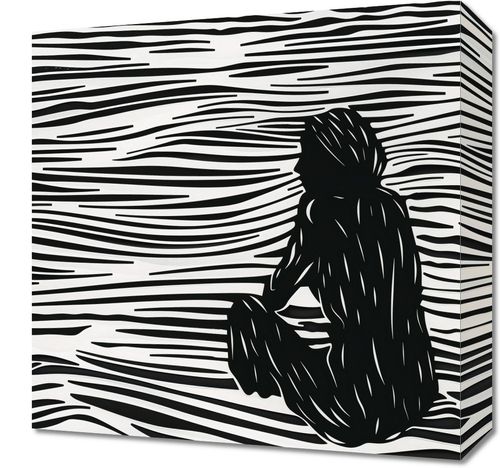 Obraz z serii abstrakcja zatytułowany Złożone Fluidalne Linie. Plakat przedstawia abstrakcyjną, czarno-białą ilustrację, w której kontrastowe, fluidalne linie tworzą efekt wzburzonej powierzchni wody. Na tej dynamicznie zarysowanej powierzchni wyłania się sylwetka osoby, która siedzi w skupieniu, z głową zwróconą w stronę obserwatora. Postać jest zredukowana do ciemnych, monochromatycznych bloków, co nadaje jej minimalistyczny, ale wyrazisty charakter. Sylwetka człowieka jest wyraźnie zarysowana i stanowi centralny punkt kompozycji, a jej kontury płynnie wtapiają się w abstrakcyjne tło. Ten artystyczny obraz łączy prostotę z głębią, sugerując kontemplację lub introspekcję. Jego prosta paleta barw i silne linie mogą przyciągać uwagę i inspirować do refleksji nad spokojem i złożonością ludzkiej natury.