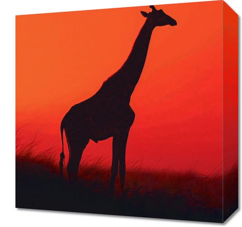 Obraz z serii natura zatytułowany Żyrafa w Czerni. Przedstawia majestatyczną sylwetkę żyrafy na tle zachodzącego słońca. Intensywny czerwony kolor nieba tworzy dramatyczne tło dla czarnej sylwetki, która wyłania się wśród wysokich traw sawanny. Subtelny gradient czerwieni przywołuje ciepło afrykańskiego słońca i dzikość naturalnego środowiska. Obraz idealnie oddaje esencję dzikiej przyrody i będzie pięknym dodatkiem do każdego wnętrza, przyciągając wzrok i inspirując do marzeń o podróżach. Doskonale pasuje do salonów w stylu etno, przestrzeni publicznych związanych z podróżami oraz pokojów o tematyce przyrodniczej.