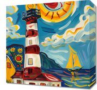 Obraz z serii abstrakcja zatytułowany Żywa Przystań to wesoła i barwna ilustracja przedstawiająca latarnię morską w nadmorskim pejzażu. Wyraziste, kręte linie i żywe kolory nadają scenie energii i ruchu, a dynamiczne słońce z żaglówką na tle morskich fal tworzy optymistyczny obraz. Latarnia morska, z jej klasycznymi czerwono-białymi pasami, stoi dumnie obok uroczego żółtego domku, a całość jest otoczona przez stylizowane kwiaty i roślinność. Styl przypomina ekspresjonistyczne dzieła z początku XX wieku, pełne życia i radości. Ten obraz jest idealny do rozjaśnienia każdego pomieszczenia, nadając mu ciepła i pozytywnej energii, świetnie sprawdzi się w przestrzeniach takich jak salony, pokoje dziecięce czy miejsca publiczne, gdzie może wprowadzić atmosferę spokoju i radosnego spędzania czasu.