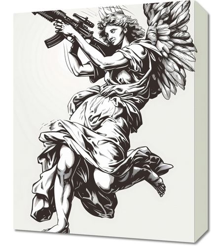 Obraz z serii pop art zatytułowany Anioł Wojny. Przedstawia on postać anioła w klasycznym stylu, jednak z nieoczekiwanym elementem współczesnym – trzyma on broń, co jest zaskakującym połączeniem tradycyjnej symboliki z nowoczesnymi motywami. Ta silna wizualna metafora może prowokować do refleksji na temat konfliktów, pokoju i dwoistości natury ludzkiej. Zastosowanie monochromatycznej kolorystyki wzmacnia dramatyzm kompozycji, a sama praca może stanowić wyrazisty akcent w nowoczesnych przestrzeniach, które cenią sobie głęboką symbolikę i odważne wyraz artystyczny.