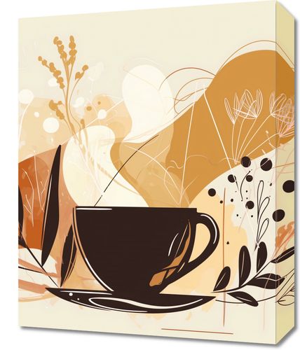 Obraz z serii minimalistyczne zatytułowany Aromatyczna Przerwa. Grafika ta przedstawia sylwetkę ciemnego kubka kawy, który jest otoczony przez abstrakcyjne kwiatowe motywy i organiczne kształty w ciepłych odcieniach karmelu, brązu i beżu, przypominających bogactwo i głębię smaków kawy. Przezroczyste i subtelne linie dodają lekkości i wyrafinowania całej kompozycji.Ten obraz świetnie odnajdzie się w wnętrzach, gdzie chwile relaksu i odpoczynku są cenione. Doskonale nadaje się do przytulnej kawiarni, jadalni, czy nawet domowej kuchni, gdzie może przypominać o przyjemności płynącej z przerwy na kawę.