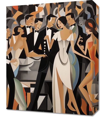 Obraz z serii abstrakcja zatytułowany Bal w Art Deco. Ta wyrafinowana grafika przenosi nas w złotą erę jazzu i glamour, prezentując grupę postaci w klasycznych strojach balowych, zanurzonych w stylizowanym, geometrycznym tle. Wzory i kształty nawiązują do estetyki Art Deco, łącząc w sobie elegancję i dekoracyjność. Centralna postać to para tancerzy, których płynny ruch i intymna poza są punktem skupienia kompozycji. Obraz ten idealnie oddaje atmosferę luksusu i wytworności, będąc doskonałym wyborem dla wnętrz inspirowanych historią, takich jak tradycyjne salony, hotele boutique, czy nawet prywatne biblioteki poszukujące sztuki z klasą.