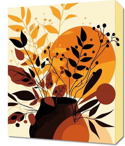 Obraz z serii minimalistyczne zatytułowany Bukiet Owoców. Grafika ta przedstawia estetyczny układ liści i owoców jesieni w klasycznym, ciemnym wazonie, umieszczony na tle ciepłych, okrągłych form w tonacji jesiennej palecie. Gama kolorów rozciąga się od intensywnego mahoń do miękkiego złota, przywołując uczucie ciepła, które towarzyszy złotej porze roku. Przemyślne rozpryski i drobne detale nadają całości dynamiki, sugerując żywotność i obfitość jesiennych plonów. Obraz ten idealnie odnajdzie się w przytulnych wnętrzach, wnosić będzie atmosferę spokoju i refleksji. Idealnie nadaje się do salonów, pokojów dziennych lub przestrzeni, gdzie dominuje naturalna paleta barw i materiałów.