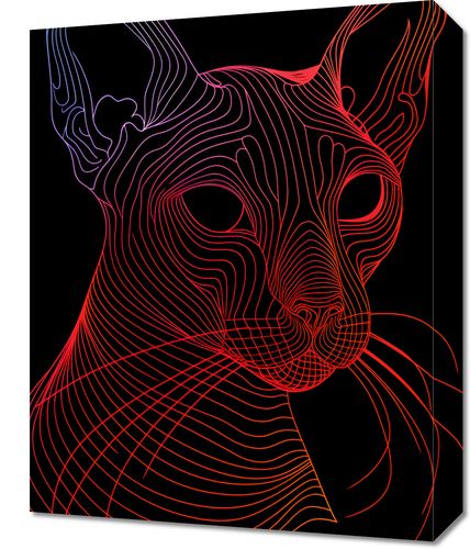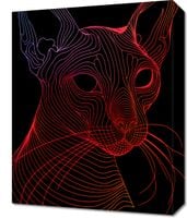 Obraz z serii pop art zatytułowany Cyfrowa Kocica przedstawia futurystyczny wizerunek kota sfinksa, wykonany za pomocą płynnych, abstrakcyjnych linii w odcieniach czerwieni i pomarańczu na głębokim, czarnym tle. Wzór linii tworzy iluzję trójwymiarowości i ruchu, podkreślając wyraziste cechy kociego profilu, takie jak duże uszy, wyłaniające się oczy i charakterystyczne rysy twarzy. Minimalistyczne użycie koloru i linii w kontraście z ciemnym tłem nadaje dziełu nowoczesny wygląd, który przyciąga wzrok i pobudza wyobraźnię. Ten artystyczny obraz świetnie wpisze się w wnętrza o nowoczesnym designie, szczególnie wśród miłośników zwierząt i miłośników sztuki cyfrowej, nadając przestrzeni odrobinę współczesnego stylu i kociego wdzięku.