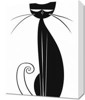 Obraz z serii abstrakcja zatytułowany Czerń Kocicy. Przedstawia minimalistyczną, stylizowaną ilustrację czarnego kota. Postać kota charakteryzuje się wydłużonym, smukłym ciałem z długimi, subtelnymi liniami, które tworzą elegancką i uproszczoną formę. Kot posiada duże, wyraziste oczy i długie wąsy, które dodają mu charakteru, a zakrzywiony ogon w kształcie spirali dodaje dynamiki kompozycji. Całość jest utrzymana w czarno-białej kolorystyce, co nadaje projektowi nowoczesnego i wyrafinowanego wyglądu. Obraz ten idealnie sprawdzi się jako dekoracja w nowoczesnych wnętrzach, wprowadzając element zaskakującej prostoty i elegancji.