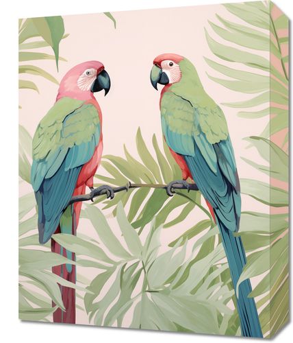 Obraz z serii wnętrza zatytułowany Dialog Ara. Na tej jasnej i pełnej życia ilustracji widzimy dwie papugi ary, które z gracją spoczywają na gałęzi, otoczone tropikalnymi liśćmi palm. Ich wyraziste, kolorowe upierzenie w odcieniach różu, zielonego i błękitu przyciąga wzrok i wprowadza egzotyczną atmosferę do każdej przestrzeni. Obraz ten jest idealnym wyborem dla miłośników natury i kolorowych, radosnych motywów, doskonale nadaje się do wnętrz, które pragną dodać odrobinę tropikalnego ciepła, takich jak jasne salony, dziecięce pokoje, a także jako dekoracja w kawiarniach i restauracjach o egzotycznym charakterze.