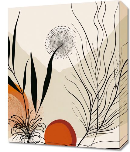 Obraz z serii minimalistyczne zatytułowany Echem przez Pustynie. Obraz przedstawia abstrakcyjny, pustynny pejzaż, gdzie organiczne kształty roślin łączą się z geometrycznymi formami słonecznych dysków. Ciemne, dynamiczne linie roślin przecinają pastelowe tło w kolorach beżu i brązu, tworząc kontrastowe ale harmonijne połączenie. Rozproszone kropki na jednym z elementów wyglądają jak drobinki piasku unoszące się w powietrzu lub delikatne nasiona rośliny gotowe do rozsiania przez wiatr. Ten obraz emanuje ciepłem i naturalnością, doskonale wpisując się w przestrzenie, które cenią sobie spokój, minimalizm i bliskość z naturą. Idealnie sprawdzi się w salonach, poczekalniach, czy jasnych korytarzach, dodając im subtelnej elegancji i organicznego charakteru.