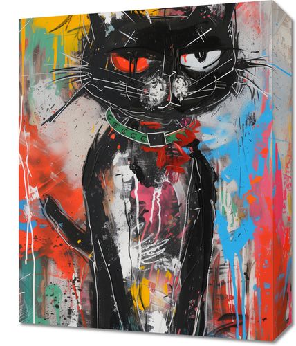 Obraz z serii abstrakcja zatytułowany Gburowaty Kiciak to odważne, street artowe przedstawienie czarnego kota z intensywnymi, czerwonymi oczami. Postać kota, zarysowana grubymi, dynamicznymi liniami, wyróżnia się na tle żywego, kolorowego graffiti. Dzieło łączy w sobie surowość miejskiego stylu z komicznym przedstawieniem zwierzęcia, co nadaje mu niepowtarzalny charakter. Drobne białe akcenty na sierści kota oraz wyraziste spojrzenie tworzą efekt, który przyciąga i utrzymuje wzrok obserwatora. Ten obraz, pełen energii i miejskiego ducha, doskonale odzwierciedla współczesną kulturową estetykę i będzie stanowił wyrazisty element dekoracyjny w nowoczesnych przestrzeniach takich jak loftowe apartamenty, kawiarnie i przestrzenie kreatywne.