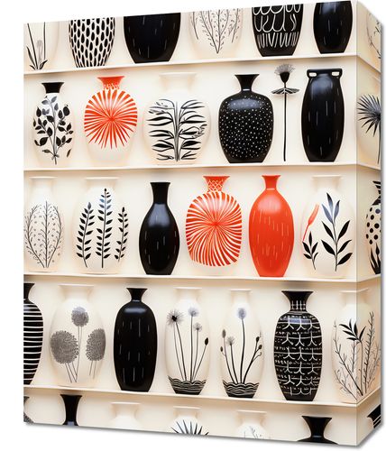 Obraz z serii wnętrza zatytułowany Gliniana Harmonia. Precyzyjnie ułożone wazony na półkach prezentują się niczym w muzeum sztuki użytkowej. Ich geometryczne i roślinne wzory, oscylujące między czernią, bielą i czerwienią, tworzą hipnotyzującą kompozycję. Prostota i elegancja tych przedmiotów, w połączeniu z ich zróżnicowaną fakturą i wzornictwem, dodają wnętrzom niepowtarzalnego charakteru. Idealnie komponują się zarówno w nowoczesnych loftach, jak i tradycyjnych pokojach kolekcjonera. Ta estetyczna kolekcja doskonale odda atmosferę w galeriach designu oraz w ekskluzywnych salonach z antykami.