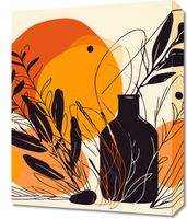 Obraz z serii minimalistyczne zatytułowany Jaskrawy Zachód. Na grafice widnieje silnie stylizowany motyw roślinny, gdzie czarne sylwetki roślin kontrastują z jaskrawo pomarańczowym i żółtym tłem, przypominającym zachodzące słońce. W tle pojawiają się delikatne, abstrakcyjne linie i kształty, dodające kompozycji głębi i tekstury.Ten plakat doskonale wpasuje się w wnętrza ożywione roślinnością, zarówno te domowe, jak i komercyjne przestrzenie typu kawiarnie lub sklepy z roślinami. Jego ciepłe barwy będą wprowadzać przytulną atmosferę i mogą stanowić żywy akcent w przestrzeniach utrzymanych w naturalnej kolorystyce.