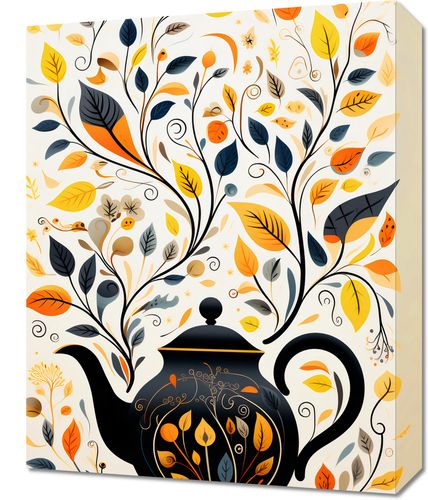 Obraz z serii wnętrza zatytułowany Jesienna Melodia. Czarny dzbanek do herbaty, zdobiony subtelnymi złotymi i pomarańczowymi wzorami, z którego wyrastają kolorowe liście i kwiaty, przypominające jesienny ogród pełen życia. Kompozycja wypełniona jest ciepłymi barwami złota, pomarańczy i brązu, które kontrastują z eleganckim czernią dzbanka. Te detale dodają obrazowi nuty elegancji i spokoju. Świetnie sprawdzi się w herbaciarniach, księgarniach jak i również w domowych salonach czy biblioteczkach.