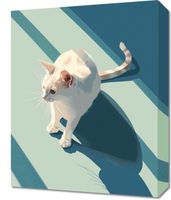 Obraz z serii wnętrza zatytułowany Kocia Persona przedstawia białego kota o intensywnie błękitnych oczach, który z gracją przemierza przestrzeń ożywioną grą cieni. Jego postawa jest skupiona i zwinna, a cień rzucony na pastelowoniebieskie tło tworzy silny wizualny kontrast, podkreślając dynamikę ruchu. Ostre linie na podłożu dodają głębi kompozycji, jednocześnie zachowując minimalistyczny charakter dzieła. Ten obraz będzie idealnym dodatkiem do nowoczesnych, jasnych wnętrz, które cenią sobie prostotę i elegancję, na przykład jako element dekoracyjny w salonie, sypialni lub przestrzeni biurowej, gdzie może dodać subtelności i lekkości.