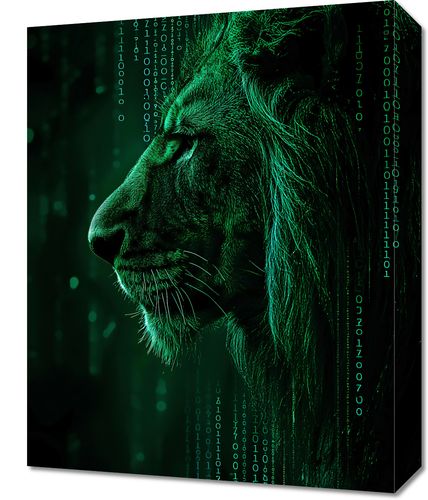 Obraz z serii pop art zatytułowany Kod Siły. Prezentuje majestatyczne oblicze lwa zanurzone w cyfrowym kodzie, który spływa w dół jak deszcz binarny, łącząc siłę i surowość natury z precyzją i logiką technologii. Zielonkawe światło podkreśla kontury i muskulaturę króla zwierząt, a cyfrowe elementy otulają jego profil, sugerując połączenie organicznego i syntetycznego świata. Ten obraz idealnie wpisuje się w nowoczesne, technologiczne przestrzenie, takie jak nowoczesne biura, pokoje gamingowe lub innowacyjne przestrzenie edukacyjne, oferując inspirację i refleksję nad współczesnym związkiem człowieka z technologią.
