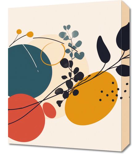 Obraz z serii minimalistyczne zatytułowany Kolaż Przyrody. Grafika ta łączy organiczne kształty i roślinne motywy z geometrycznymi figurami. Prezentuje bogate połączenie kolorów - od głębokiego granatu przez czerwień, musztardowy żółty po delikatne beże. Wyróżnia się przez obecność roślinnych sylwetek na pierwszym planie, które nadają kompozycji naturalnego charakteru.Ten obraz będzie wspaniałym dodatkiem do wnętrz, gdzie panuje spokój i równowaga. Jego stonowana, ale wyrazista kolorystyka sprawi, że będzie doskonałym uzupełnieniem przestrzeni skandynawskich, minimalistycznych, a nawet boho. Wydaje się być idealnym wyborem do salonu, sypialni lub miejsca pracy dla osób ceniących sobie połączenie sztuki i natury, gdzie mógłby stać się centralnym elementem dekoracyjnym.