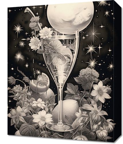 Obraz z serii wnętrza zatytułowany Kosmiczny Eliksir. Niesamowita kompozycja przedstawiająca kieliszek, z którego wylewa się galaktyczny nektar, otoczony kwiatami i roślinami w monochromatycznych barwach. Centralnym punktem jest lśniąca pełnia księżyca, której blask odbija się w szkle, tworząc atmosferę tajemnicy i magii. Gwiazdy migoczą w tle, nadając całości głębokiego, nieskończonego wymiaru. Delikatne linie i szczegóły graficzne wzbogacają kompozycję, czyniąc ją idealnym wyborem do nowoczesnych salonów, galerii sztuki oraz miejsc o tematyce astronomicznej.