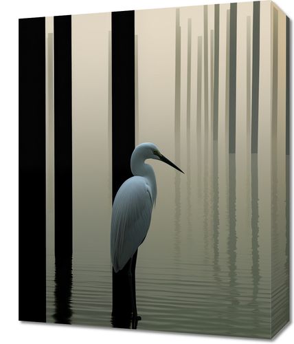 Obraz z serii pejzaże zatytułowany Mgiełka na Wodzie. Ten obraz przedstawia czaple stojącą nieporuszenie w spokojnych wodach, z tłem rozmytych słupów tworzących abstrakcyjną, niemal surrealistyczną kompozycję. Delikatne odcienie szarości i beżu, wraz z subtelnymi odbiciami w wodzie, tworzą wrażenie głębi i spokoju. Idealnie pasuje do wnętrz o minimalistycznym, nowoczesnym designie, a także do przestrzeni takich jak gabinety terapeutyczne, spa, lub jako element dekoracyjny w salonach i poczekalniach, wprowadzając atmosferę wyciszenia i kontemplacji.
