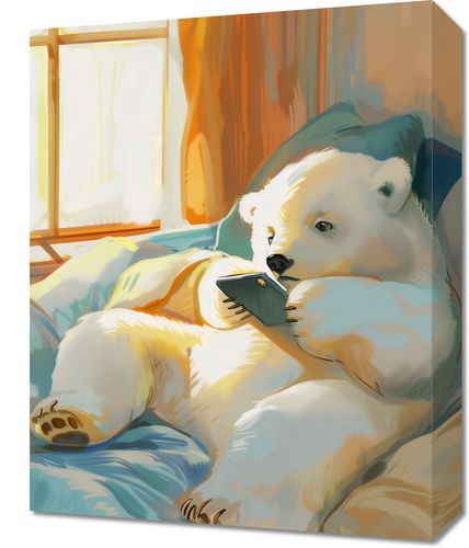 Obraz z serii abstrakcja zatytułowany Misiowe Popołudnie przedstawia uroczego, białego niedźwiadka polarnego, który odpoczywa na miękkiej pościeli, ciesząc się ciepłymi promieniami słonecznymi wpadającymi przez okno. Niedźwiedź wydaje się być zatopiony w lekturze, trzymając w łapach mały telefon, co dodaje humorystycznego i ludzkiego akcentu do sceny. Ciepła kolorystyka, od złocistych po pastelowe błękity, tworzy atmosferę spokoju i relaksu. Jasne światło i cienie na pościeli nadają głębi i tekstury, tworząc przytulne środowisko. Ten obraz doskonale wpasuje się w przestrzenie, które cenią sobie spokój i domowe ciepło, takie jak pokoje dziecięce, miejsca do czytania lub rodzinne salony.