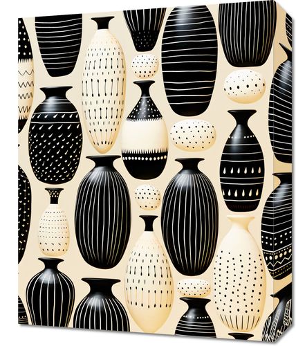 Obraz z serii wnętrza zatytułowany Monochromatyczna Harmonia. Wizualne bogactwo wazonów, malowane w klasycznych odcieniach czerni i bieli, z różnorodnymi geometrycznymi i organicznymi wzorami. Każdy wazon z tej kolekcji zdaje się opowiadać własną historię, od falistych linii przypominających fale morskie po kropki układające się w gwiaździste konstelacje. Beżowe tło podkreśla elegancję i subtelność tych wazonów, tworząc spójną całość. Te dekoracje wprowadzą powiew nowoczesności i klasyki zarazem, doskonale wkomponowując się w przestrzenie luksusowych butików, eleganckich restauracji czy nowoczesnych galerii sztuki, które pragną wzbogacić swoje wnętrza o elementy wyrafinowanej estetyki.
