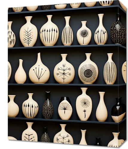 Obraz z serii wnętrza zatytułowany Monochromatyczne Cuda. Perfekcyjnie wykończone wazony w beżach i głębokich czerniach prezentują subtelne, ale intrygujące wzory inspirowane naturą. Każdy wazon jest unikalny, niektóre ozdobione są delikatnymi motywami roślinnymi, podczas gdy inne błyszczą pełnią złotych kropek czy geometrycznych form. Głębokie tło podkreśla delikatność beżu i dramatyczność czerni, tworząc efektowny kontrast. Ta kolekcja wazonów emanuje spokojem i elegancją, idealnie wpisując się w przestrzenie minimalistycznych galerii sztuki, nowoczesnych hoteli czy eleganckich biur, które pragną dodać swoim wnętrzom nutę wyrafinowania