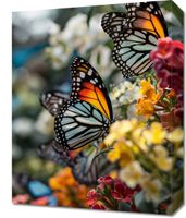 Obraz z serii natura zatytułowany Motyle Na Łące. Na obrazie widnieje trio monarchów, które z gracją spoczywają na kwitnących kwiatach, ich pomarańczowo-czarno-białe skrzydła wyłaniają się z tła pełnego barw i życia. Delikatne odcienie kwiatów w różnych odcieniach żółci, czerwieni i pomarańczy podkreślają naturalne piękno i delikatność motyli, a rozmyte tło nadaje kompozycji głębi i subtelności. Ten obraz jest celebracją życia i przemijania, idealnym do wnętrz, które pragną odzwierciedlić piękno i efemeryczność przyrody, jak salony, spa, czy pokoje wypoczynkowe.