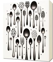 Obraz z serii wnętrza zatytułowany Narzędzia Smaku. Eleganckie sylwetki sztućców w różnorodnych kształtach i wzorach, podkreślane przez subtelne detale i geometryczne punkty, tworzą harmonijną i równocześnie zaskakującą kompozycję. Czarne i białe tony nadają prostotę i wyrafinowanie, podczas gdy unikalne projekty sztućców dodają nuty kreatywności i innowacji. Idealnie sprawdzi się w nowoczesnych kuchniach, restauracjach o minimalistycznym designie oraz w przestrzeniach dedykowanych sztuce kulinarnej.
